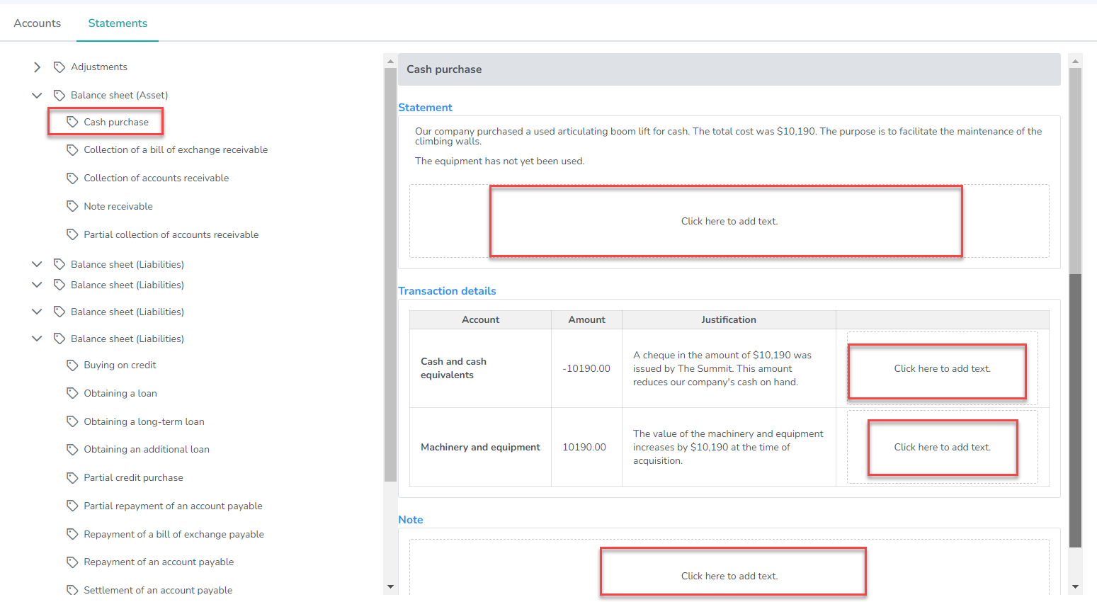 - You can also add additional information to the Transaction details section, which is what the student can see after they complete the statement.